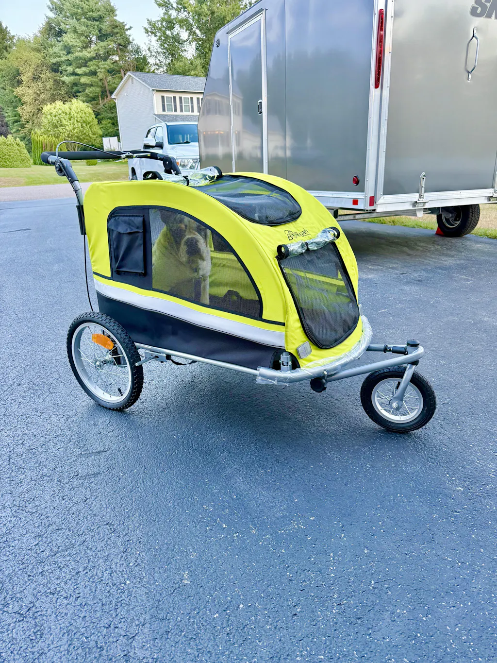 I have not used it as a trailer yet, but I LOVE IT as a carriage! I have a 6 month old bulldogge that can’t walk more than a 1/2 mile so I take the trailer with us and he rides after he’s done walking. So nice! Well made and smooth riding!