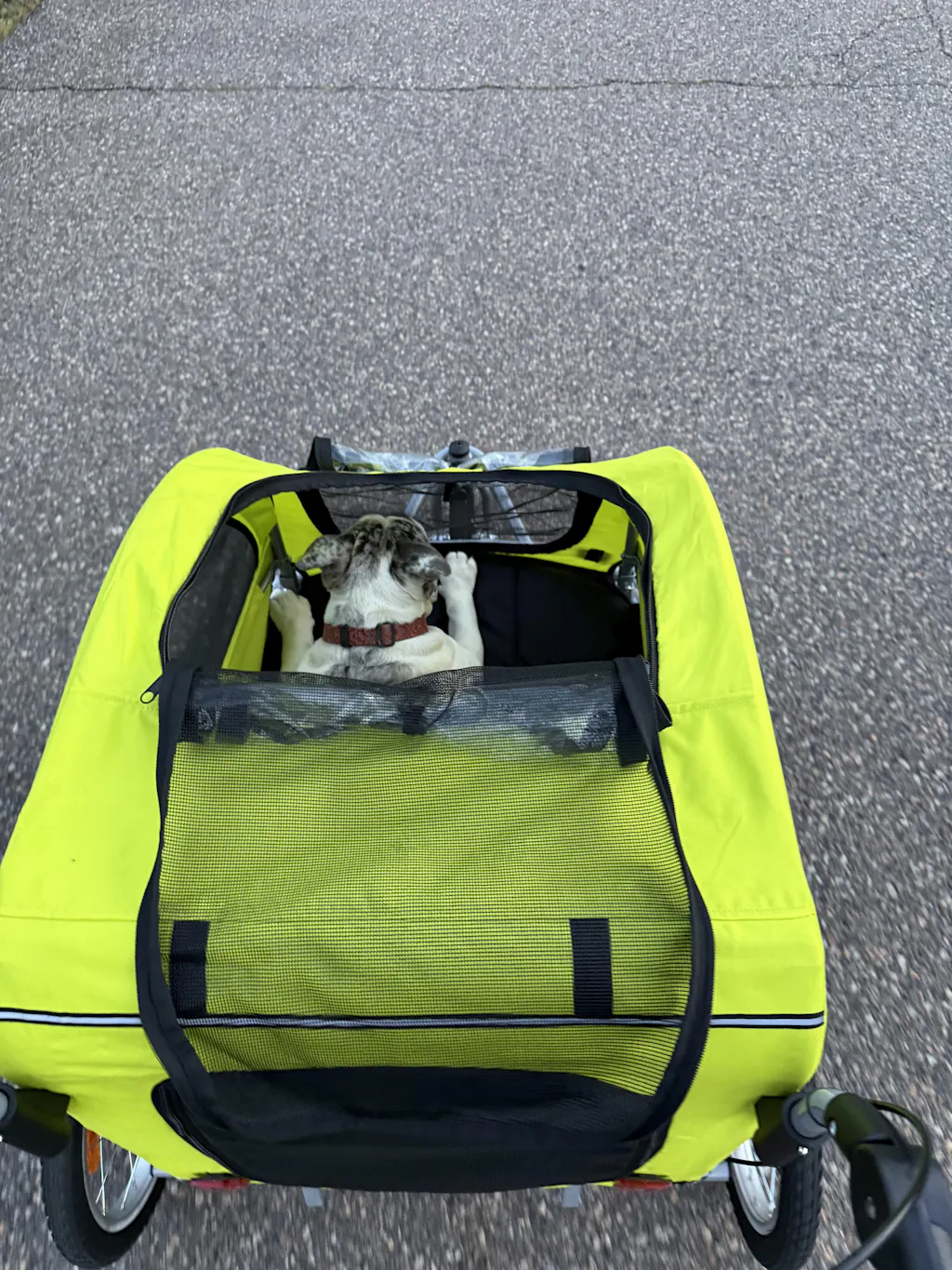 I love the stroller. I goes smoothly over cracks in the pavement. My two dogs fit well. My only issue is